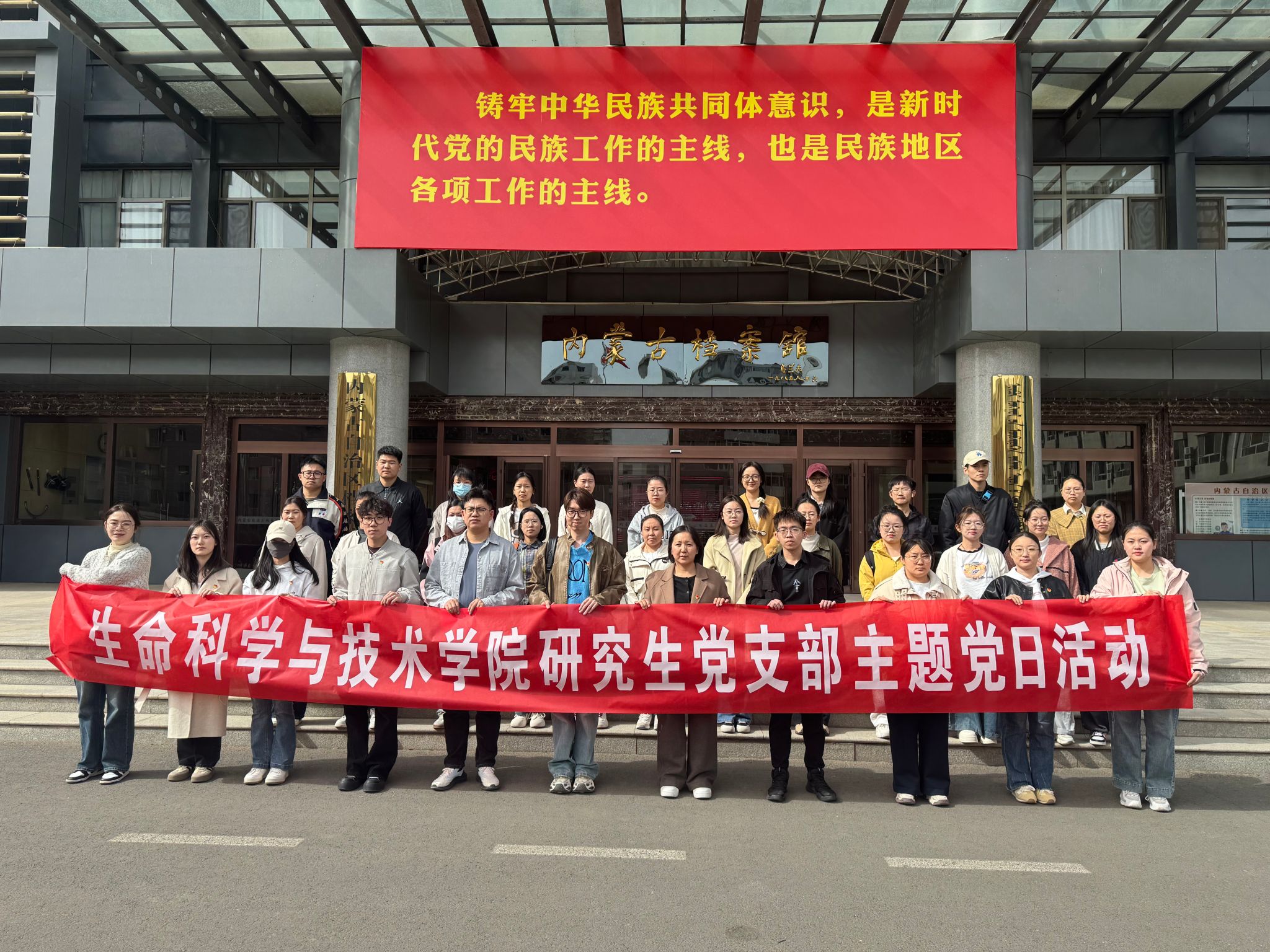 在铸牢中华民族共同体意识档案文献展中,党员们深入了解了内蒙古自治区各族人民在党的领导下团结奋斗、共同发展的光辉历程。展览充分体现了中华民族多元一体格局的发展脉络与团结精神,进一步增强了党员的政治认同、文化认同和历史责任感。活动最后,全体党员在党旗下庄严肃立,重温入党誓词。铿锵有力的誓言再次唤醒初心、坚定信仰,增强了遵规守纪的自觉性和干事创业的使命感。