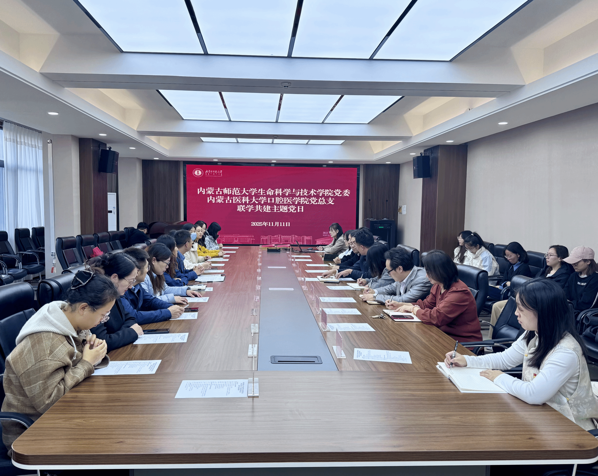 为深入学习贯彻党的二十届四中全会精神,强化基层党组织政治功能与组织功能,探索校际党建共建与学科融合新模式,11月11日下午,beat365在线唯一官网与内蒙古医科大学口腔医学院开展联学共建主题党日活动。两院领导班子、党支部书记、科室负责人和部分党员师生代表参加活动。主题党日活动由苏小波主持。