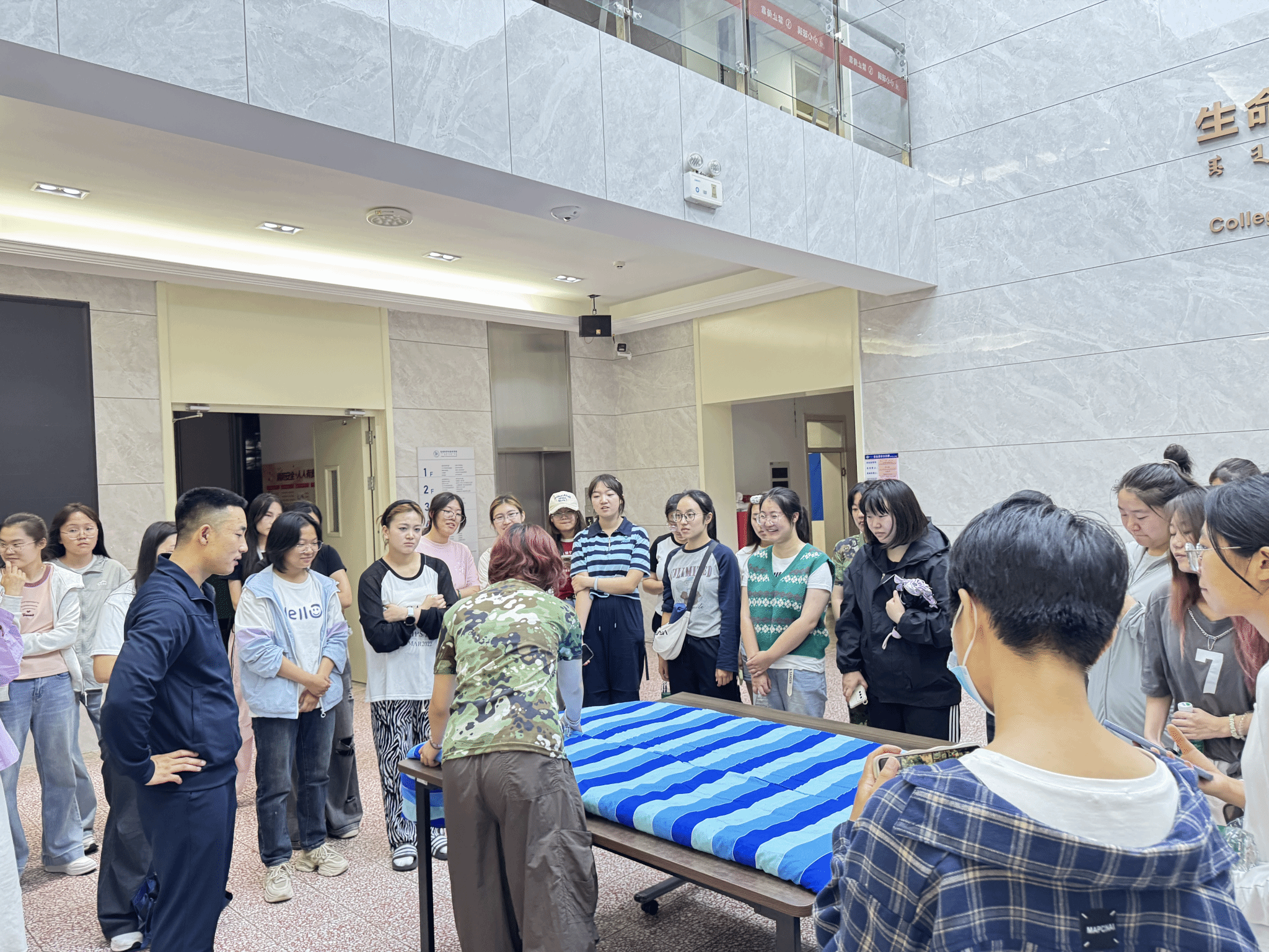邀请到了退伍大学生我院2025级学硕班李德龙同学给新生们展示“豆腐块”式军被的叠法。学长手把手地示范动作要领,从铺平、折角到压实、定型,每一个步骤都需要耐心与细致。军训不仅锻炼身体,更是对意志品质和生活习惯的磨砺。