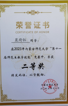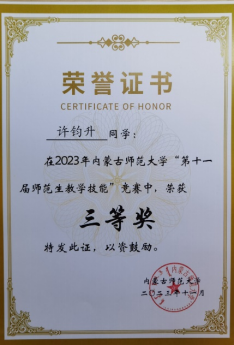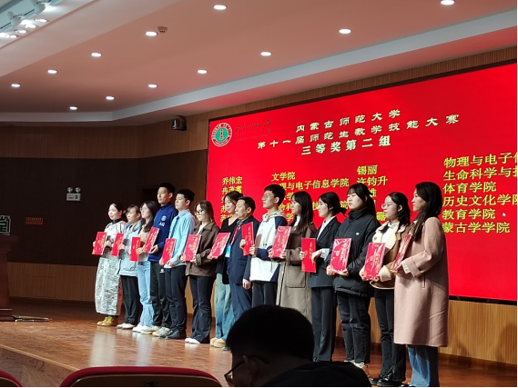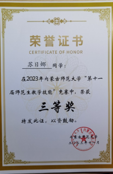 beat365在线唯一官网“第十一届师范生教学技能”竞赛于2023年11月4—5日在盛乐校区隆重举行,在本次比赛中,我院经过层层选拔,选派2020级生物科学汉2班的裴琦钰、许钧升和2021级生物科学蒙班的苏日娜共三名同学参加了本次技能大赛,指导教师为李景环、牛艳芳、高峰和乌云高娃。经过赛前师生的精心准备和赛场上的激烈角逐,最终裴琦钰同学获得二等奖,许钧升和苏日娜同学获得三等奖。