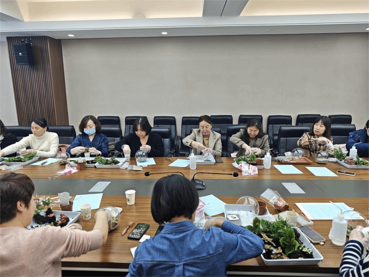 活动现场,专业花艺师通过理论讲解与实操演示相结合的方式,向老师们传授了制作生态微景观的基础知识,包括花材搭配、色彩协调、造型设计等技巧。在花艺师的指导下,大家从挑选花材到层次布局,从定型到装饰,逐渐完成属于自己的生态微景观作品。