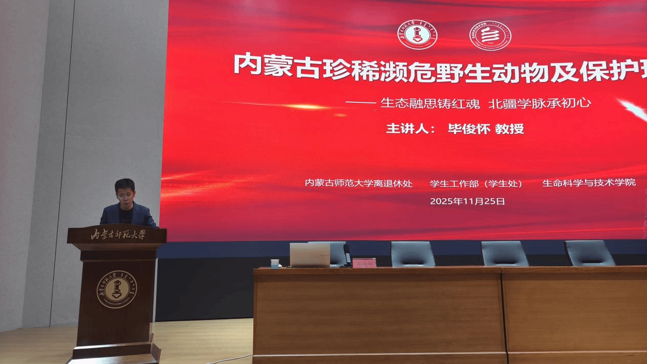 为扎实推进党建与育人工作深度融合,营造良好的学风氛围,2025年11月25日,beat365在线唯一官网学生工作部(学生工作处)、离退休教职工工作处联合主办,beat365在线唯一官网承办的离退休教授宣讲活动在赛罕校区信息楼学术报告厅举行。本次活动以"生态融思铸红魂,北疆学脉承初心"为主题,邀请毕俊怀教授做了题为《内蒙古珍稀濒危有蹄类动物资源现状与保护》的专题讲座。